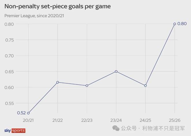 而放眼本賽季英超,場均定位球進(jìn)球(不算點(diǎn)球),已經(jīng)從此前四個賽季的0.6-0.65之間,激增到本賽季的0.8球。